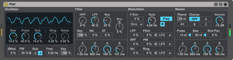 New Instruments inside Max Essentials: Poly (Polyphonic Synthesizer), Bass (Monophonic Synthesizer) and Multi (a synth designed for immediate tweakability from Push)