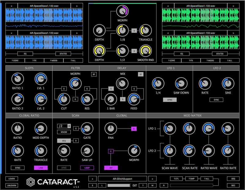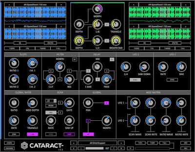 Cataract is a Segment Multiplexer plugin geared toward electronic music production and experimental sound design. Cataract features an arsenal of sample scanners with integrated modulation sequencers and morphing functions. This makes it possible to construct architecturally complex patterns ranging from nuanced percussive articulations to intricate particle sound effects and all out generative hyper glitch chaos.