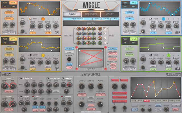- Built-in effects – 7 built-in effects can also be modulated and make a WIGGLE sound more interesting. 4 Operators could go through duo multi-mode filter parallel.