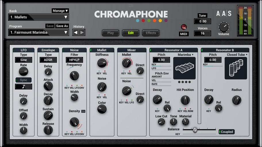 Chromaphone 2 is a synthesizer which uses acoustic resonators to create drum, percussion, mallet, string, and other unique instruments. Drumheads, bars, marimbas, plates, strings, and tubes are combined into pairs and played by a configurable mallet and a flexible noise source. A proprietary coupling technology, which models precisely how vibrating objects interact and influence each other, captures key acoustic behaviours of musical instruments, resulting in a library of truly expressive instruments in a vast range of sonic colours.
