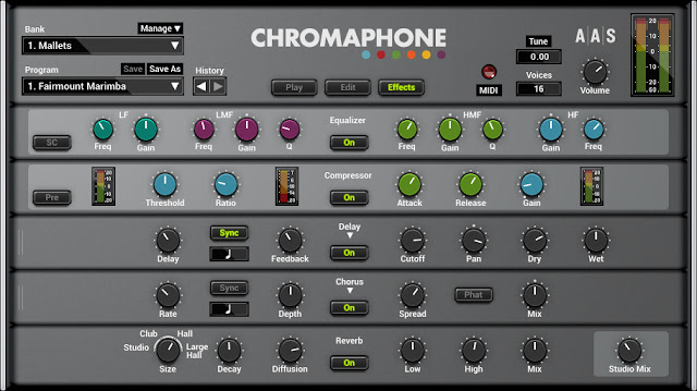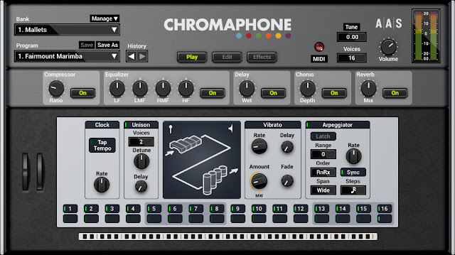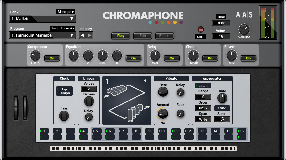 Streamlined interface: Redesigned from the ground up, the new interface now divides Chromaphone 2 into three panels: Play presents shortcuts to the performance and effect parameters including bypass switches for quick edits; Edit lets you tweak and create your sound; while FX supplies equalizer, compressor, multi-effect, and reverb processors for a final sheen.