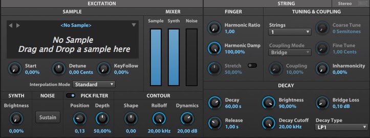 The Pluck oscillator has been updated with extended sample controls including Start Time, Detune and Key Follow, the Noise section now includes a Sustain Mode and the String section a stereo mode.