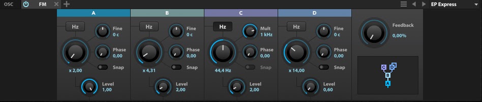 Major enhancements have been made to the FM and Pluck oscillators, further extending Falcon’s synthesis capabilities. The FM oscillator has been redesigned with new controls per-operator including a fixed frequency toggle (Hz mode), fine ratio control (operates as a frequency multiplier in Hz mode), phase start control and harmonic snap mode.