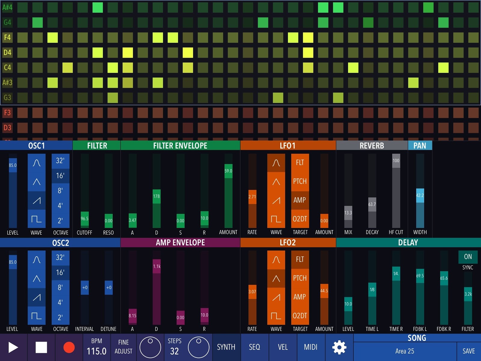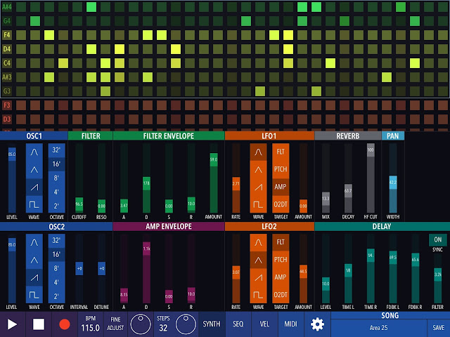 Create patterns and modify them in real time, or let Xynthesizr do it for you using its morphing algorithms. Change scale and key, or transpose within a scale on-the-fly. Tweak parameters of the internal synthesizer or output MIDI to your favorite apps and devices. Record and share your creations.