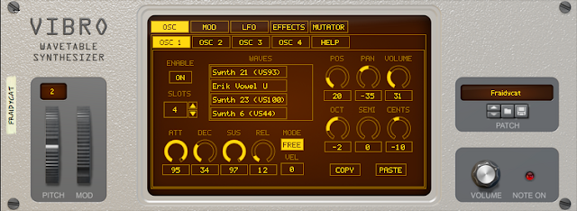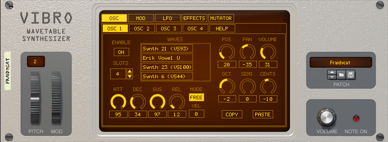 - 4 oscillators that can each sweep across up to 4 wavetable slots