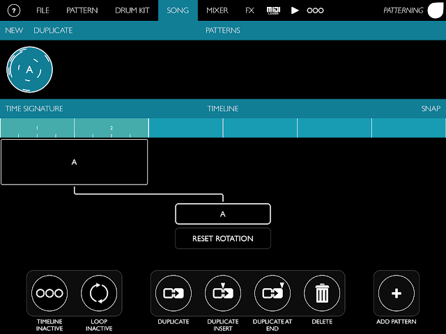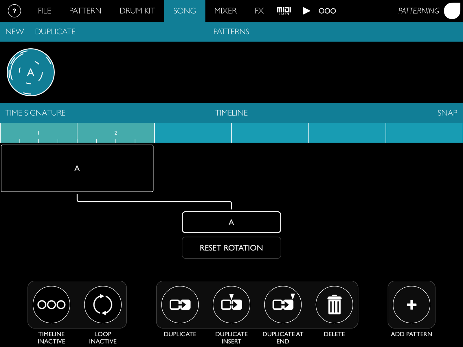 Patterning’s timeline has been updated, making the creation of songs a whole lot easier and more fun. You can now make multiple selections, and use “duplicate,” “duplicate insert,” and “duplicate at end” tools to quickly repeat sections of the timeline. In addition, each timeline block now has a “reset rotation” option to allow patterns to snap to their beginnings in the timeline. This is useful for rotating or odd meter patterns, as well as creating stutters or fills in the timeline.