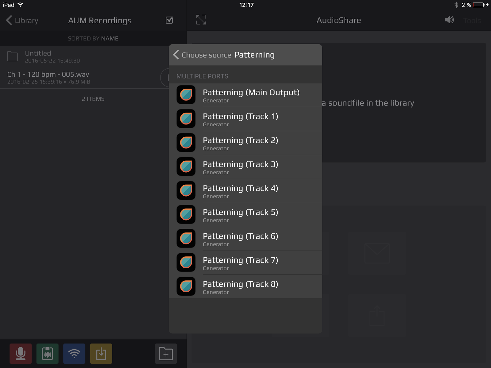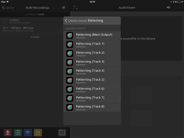Patterning now supports individual Inter-App Audio outputs for each track as well as the master output. Connect up tracks to Audiobus, AUM, or another Inter-App Audio host to apply effects to individual tracks.