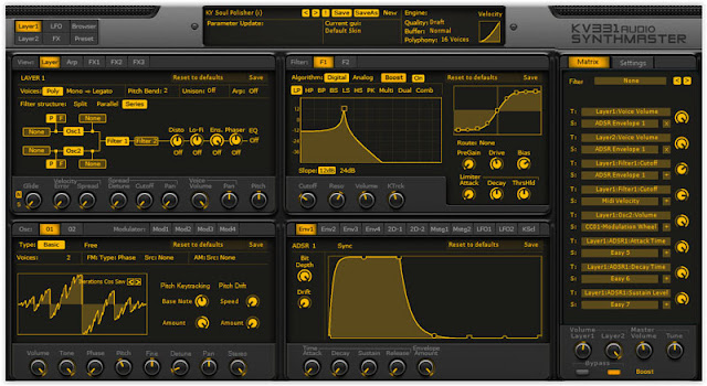 - Semi-Modular Architecture: For each SynthMaster instance, there are 2 layers followed by 2 global effect send busses. Each layer has its own: Arpeggiator, 2 Oscillators, 4 Modulators, 2 Filters, 4 ADSR Envelopes, 2 Multistage Envelopes, 2 2D Envelopes, 2 LFOs and 4 Keyscalers. The modulators can modulate frequency, phase, amplitude or pulse width of the oscillators or any other modulators at audio rate.