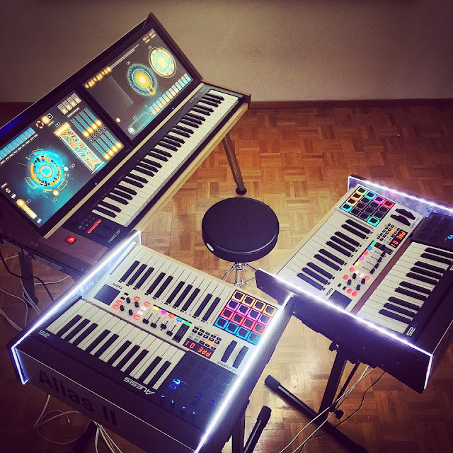 On Facebook, the musician 2BTruman shared this self designed Instrument setup up. Interesting to see how you can build an virtual instrument setup with M-Audio, Nektar and Alesis Controllers. I can’t say what kind of displays or touch device he use but it looks great.