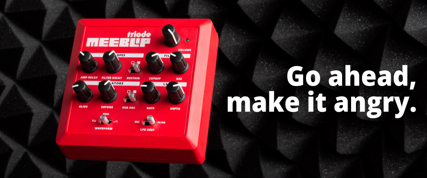 Small. Dirty. Deep. MeeBlips are not polite, and they’re not pristine. They’re deceptively tiny, simple synths that make big, grimy sounds.The award-winning MeeBlip anode was already capable of producing ridiculous bass sounds. So with triode, we challenged ourselves to make things even more extreme. Triode’s huge sound is driven by three oscillators and a unique twin-t analog lowpass filter. Switch on the pure square wave sub-oscillator and punish your favorite subwoofers.