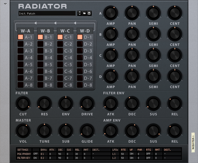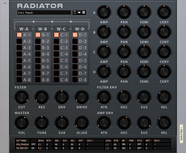 Radiator also features a control panel for settings and modulations. Polyphony can be enabled/disabled, as can filter key tracking.