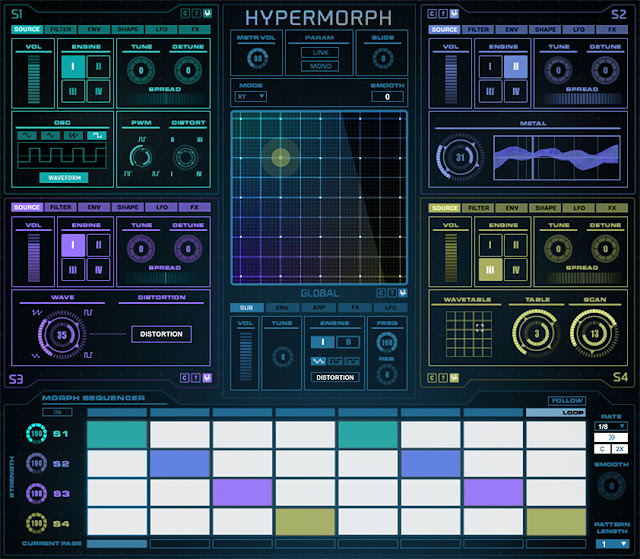 Hypermorph, a shapeshifting synthesizer that layers and transforms your sound in realtime. The instrument’s design features four independent sound sources and an XY Morph Matrix that can blend, morph and mutate between each sound on the fly. Combining this tonal flexibility with its built-in Morph Sequencer, Hypermorph launches your musical progressions into new sonic territory with its unique sound blending and rhythmic choppy phrases.