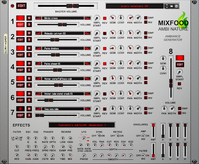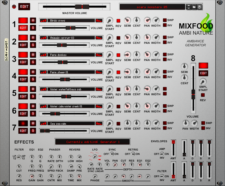 283 Super High Quality nature samples, looped and solo. For generating real sounding nature ambiances. Water, wind, rain, thunder, birds, frogs, farm animals, waves, etc… 7 Generators are at your fingertips for creating amazing ambiances. 1 extra Generator to play solo sounds like birds, dogs, cats, frogs, farm animals, waves, thunderclaps and more.