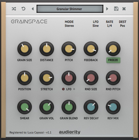 GrainSpace is a granular processor focused on real-time granularization and reverberation of the incoming audio signal.GrainSpace provides dynamic grain generation (up to 32 per channel), 7 grain parameters, 3 grain modulators (including an 11 waveforms LFO), smearing and reverb to create crazy sound effects, rich textures and much more.