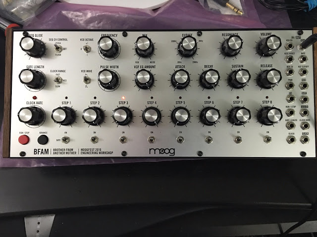 If you remember, maybe last year, the company offered in their VIP workshop the BFAM, the Brother From Another Mother Synthesizer, a very special Synthesizer. The features of this synth was: Single VCO (Saw & Pulse wave form), Noise, Mixer, ADSR envelope, Pulse width, VCF with cutoff and resonance and VCF EG amount control. Also he had a 8-stage analog step sequencer , wth control over glide, gate length, clock rate and per step gate control. What was cool the sequencer can be routed to pitch, filter cutoff, or another destination via the patch point.