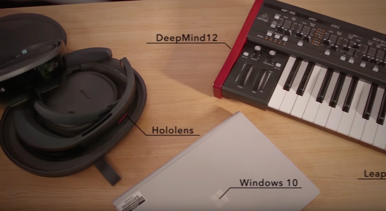 From the technology point, the augmented reality of the Behringer DeepMind 12 Synthesizer is based on the Microsoft Hololens, a Windows 10 computer and a Leap Motion to sense your hand position.