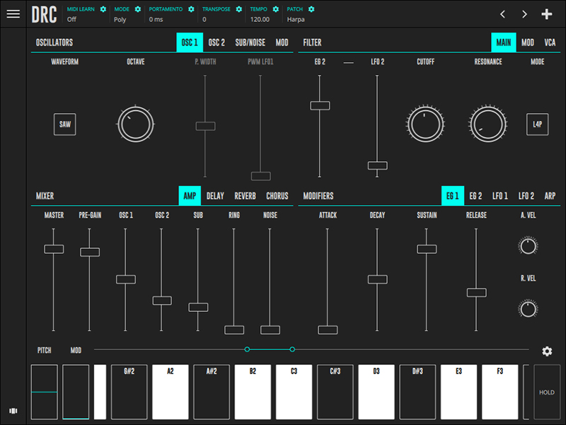 DRC is a virtual analog polyphonic synthesizer that recreates the characteristic sound of an analog synthesizer targeting all music makers, from novices to professionals, proving a minimal but powerful set of parameters, for limited but incredible sonic capabilities. While the sound may invoke the vintage characteristic of an analog synth, the user interface was developed with the XXI century in mind. Large controls, even on a phone sized screen, allows users to easily interact with synth parameters on a uncluttered interface.