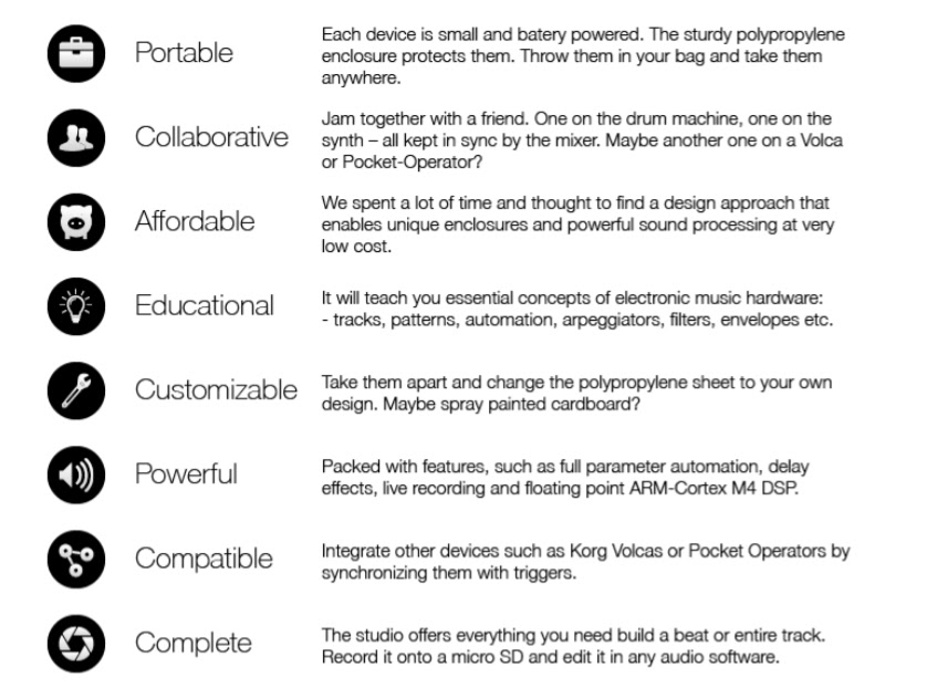 The project started in early 2016 with the idea of creating something that still follows the Patchblocks philosophy in terms of accessibility, affordability and fun. Feedback from customers and retailers pointed to something more hardware, less software. The result was not just one single unit, it ended up in a whole product line, which combines a lot of different studio hardware in a small size.