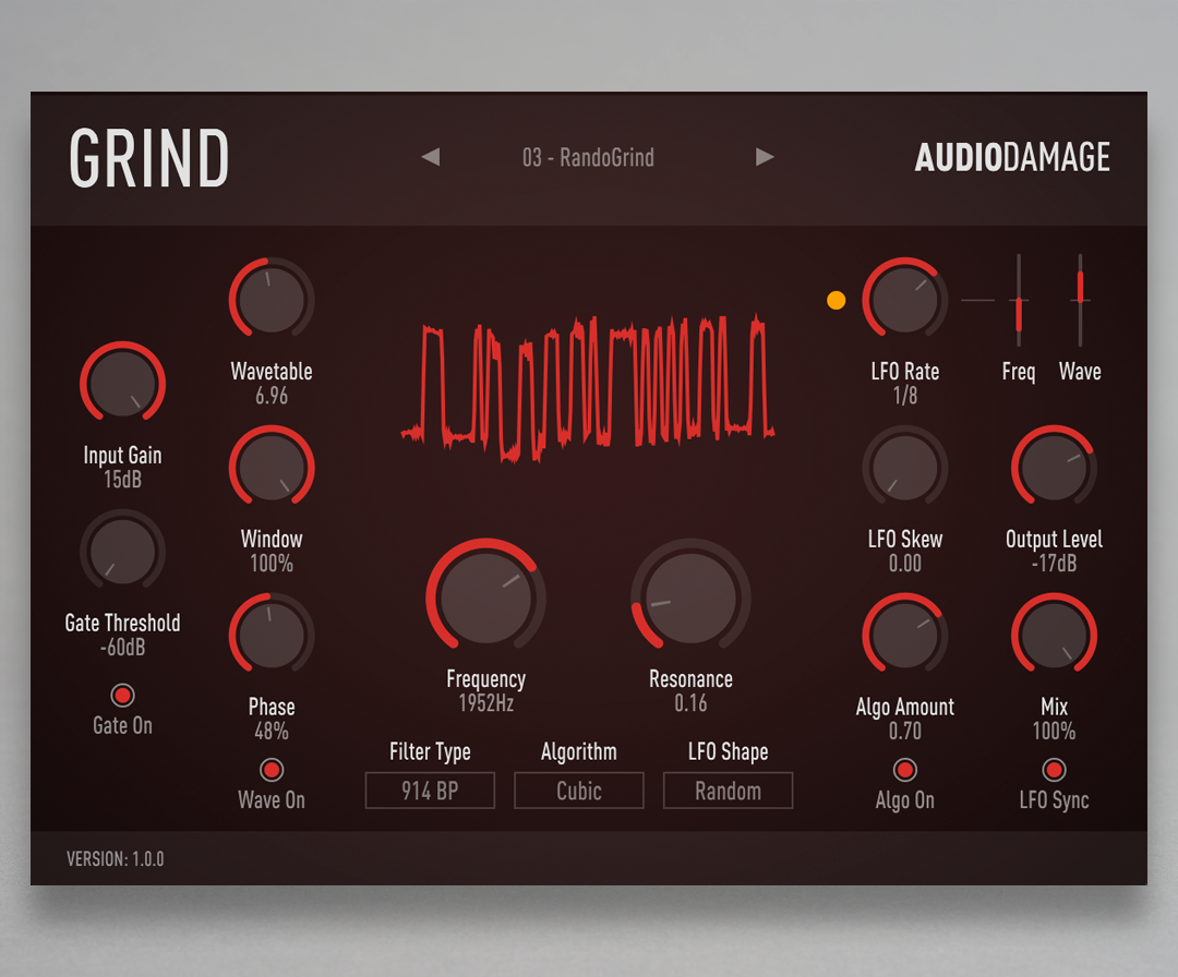 A true powerhouse of audio warfare, Grind puts the “damage” in Audio Damage. From subtle tube-style saturation to full-on mangled wavetable distortion, Grind is a Swiss Army Knife of sound design. Grind consists of three main blocks: wavetable lookup, in to algorithmic saturation/distortion/, and finally to a multi-mode filter. The wavetable module uses the amplitude of the incoming signal to replace the sample with one from 15 different linearly-interpolated wavetables, chosen for their mangling potential. Window size and phase controls provide further tone-shaping possibilities.