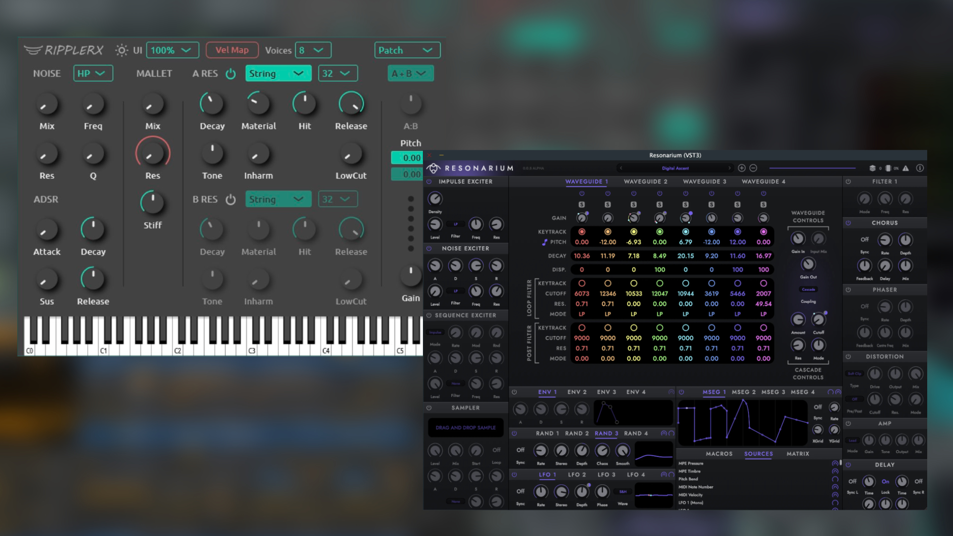 First, Tiago Rippler X is a percussive physical modeling synthesizer heavily influenced by the AAS Chromaphone 3.