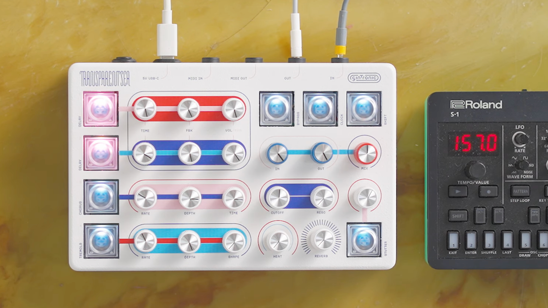 ginTronic transparentSea is a new desktop, hands-on stereo multi-FX processor with no screen or menu-diving made for performances.