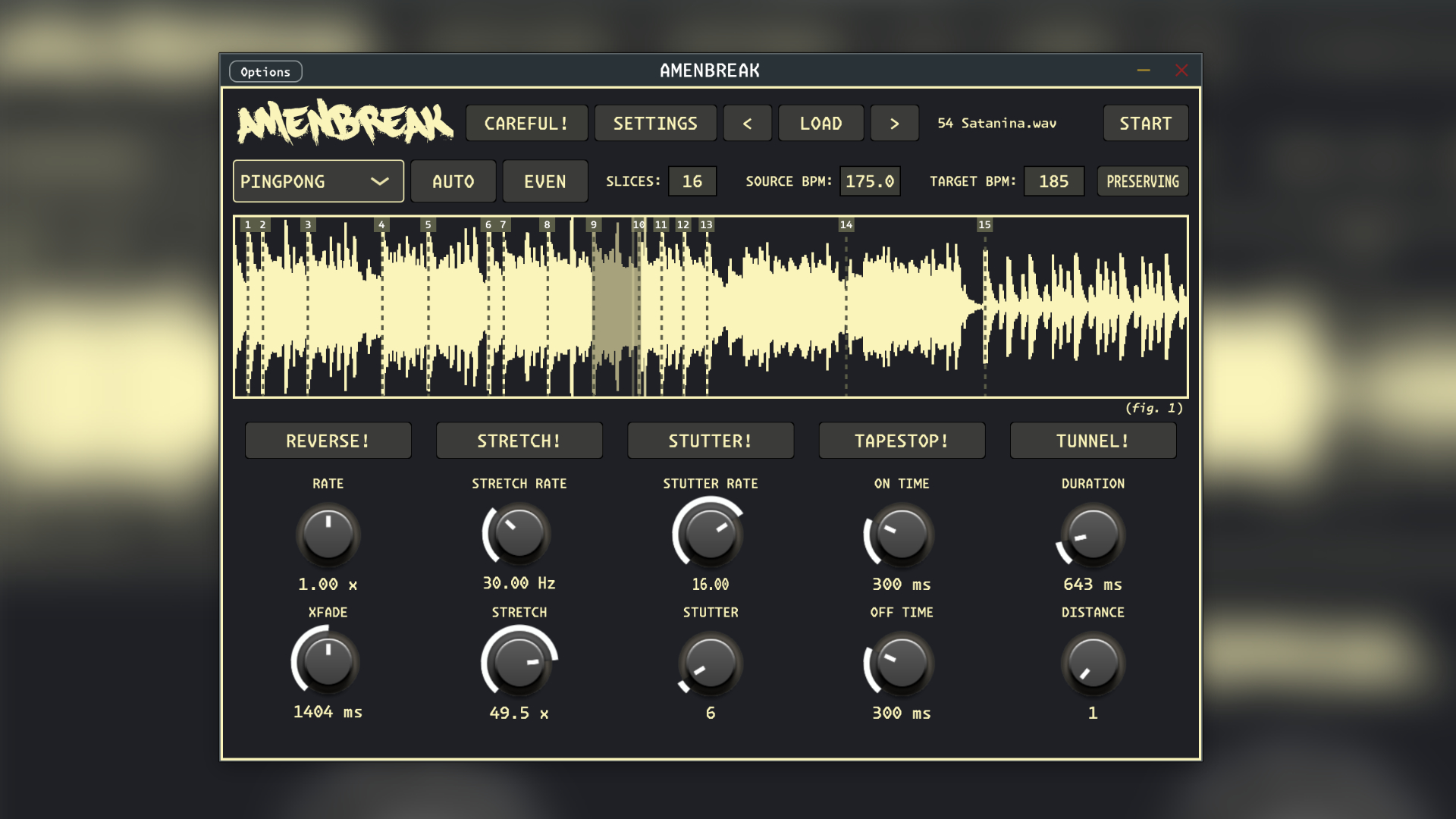 The core is based on Amenbreak, a well-known drum break, and on the slicing technique applied to it. It’s straightforward to use. You load a sample or, better yet, a loop into the Ambreak VST, and the fun begins.