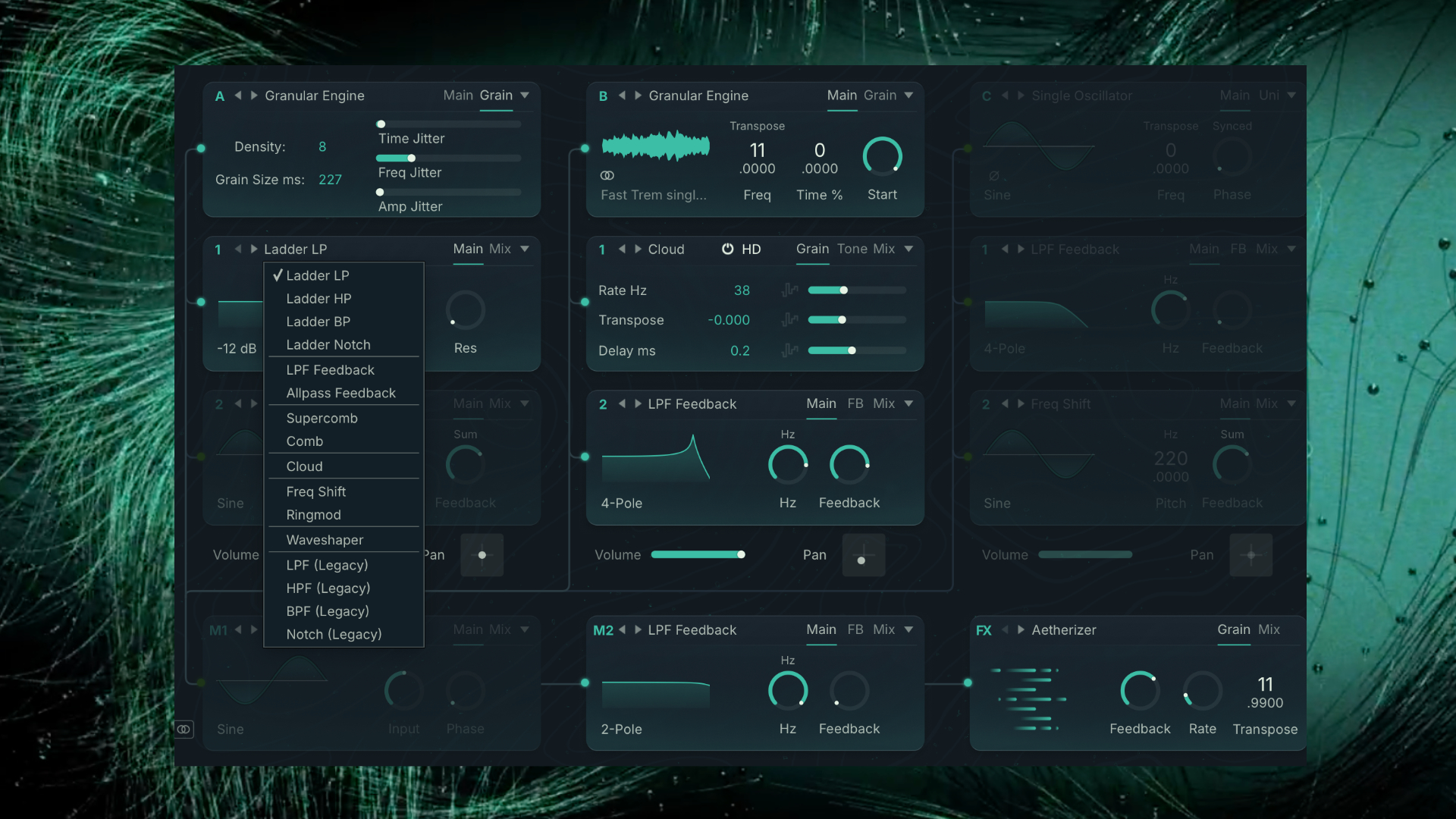 From the oscillator section, we move to the two shaping slots, where you can find classic filters as well as special ones, such as the original Supercomp, Allpass Feedback, and the Cloud filter.