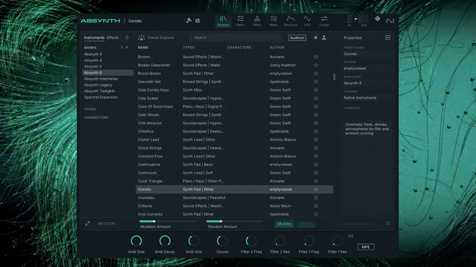 Don’t worry, the beloved Mutator function from the original Absynth is also part of the new browser. It still offers the same features, including the module locking matrix, two main parameters, and a fine-tuning section.