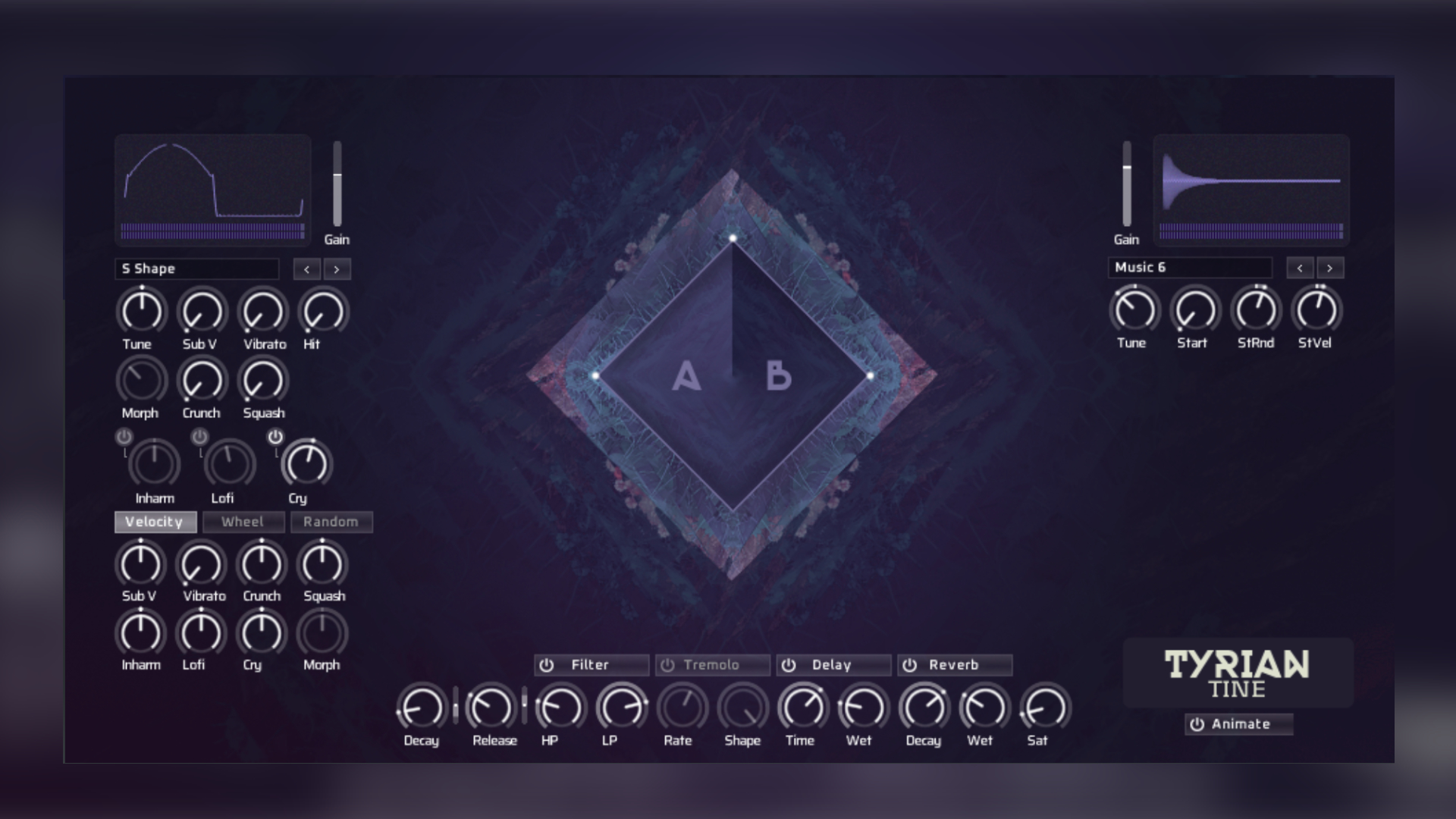 Tyrian Tine is a hybrid, asymmetrical, dual-layer engine featuring a wavetable and a sample oscillator. It’s designed for generating unique, randomized bell and chime tones.