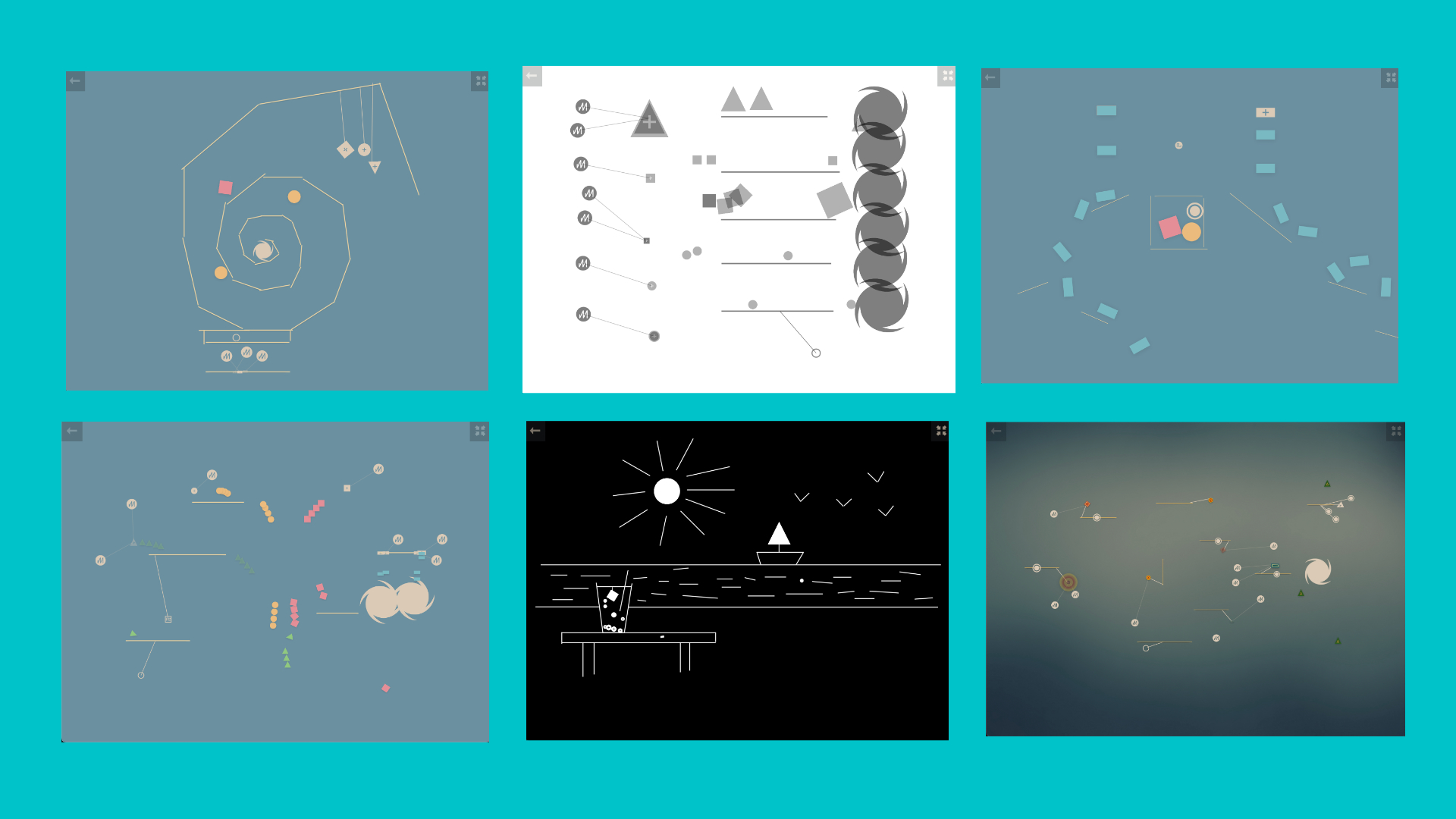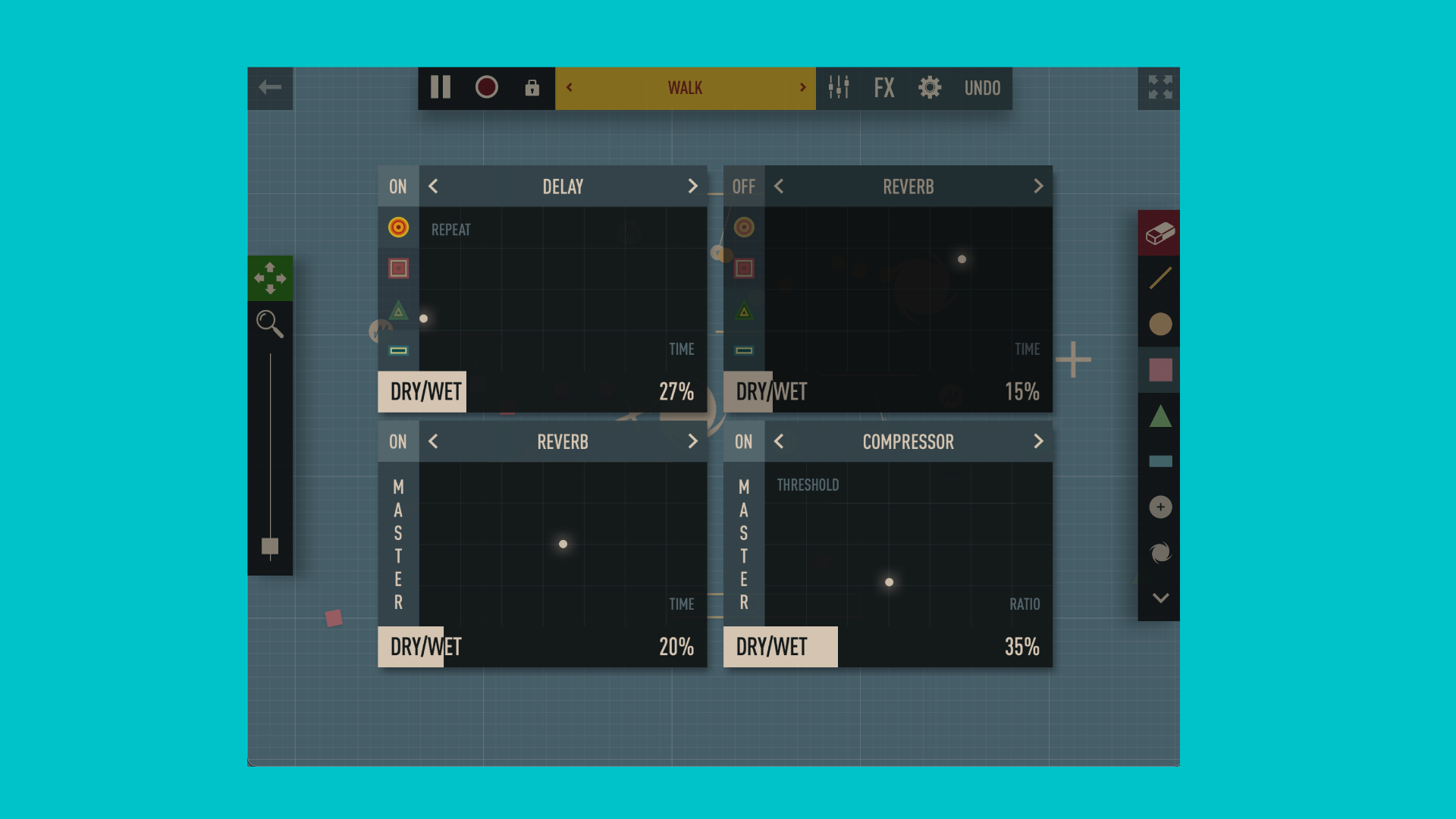 It all starts on a playing field where you can choose from four unique designs (skins) by Jonas Eriksson: classic, B&W, Phantom, and Pastel. You won’t find a classic white/black-key keyboard here; instead, you paint and draw that trigger the physics-based engine.
