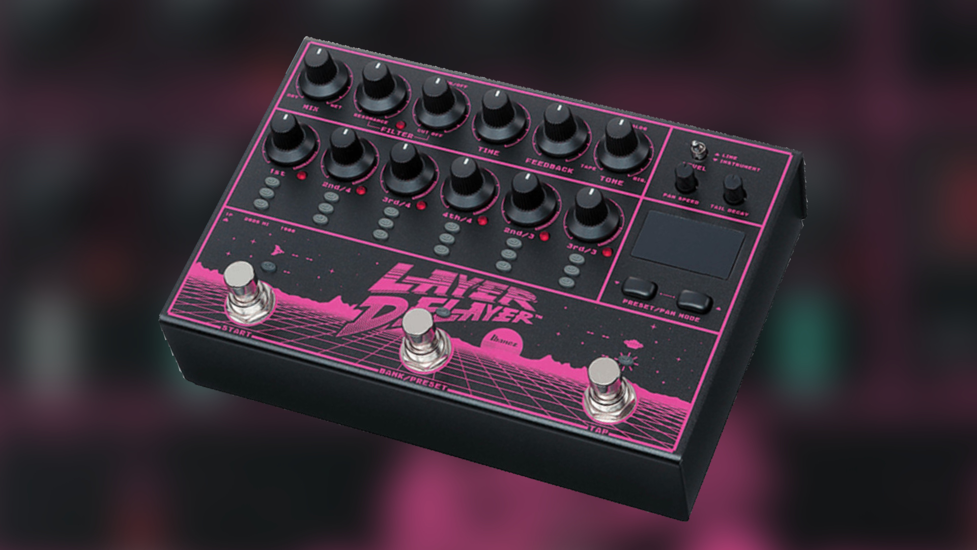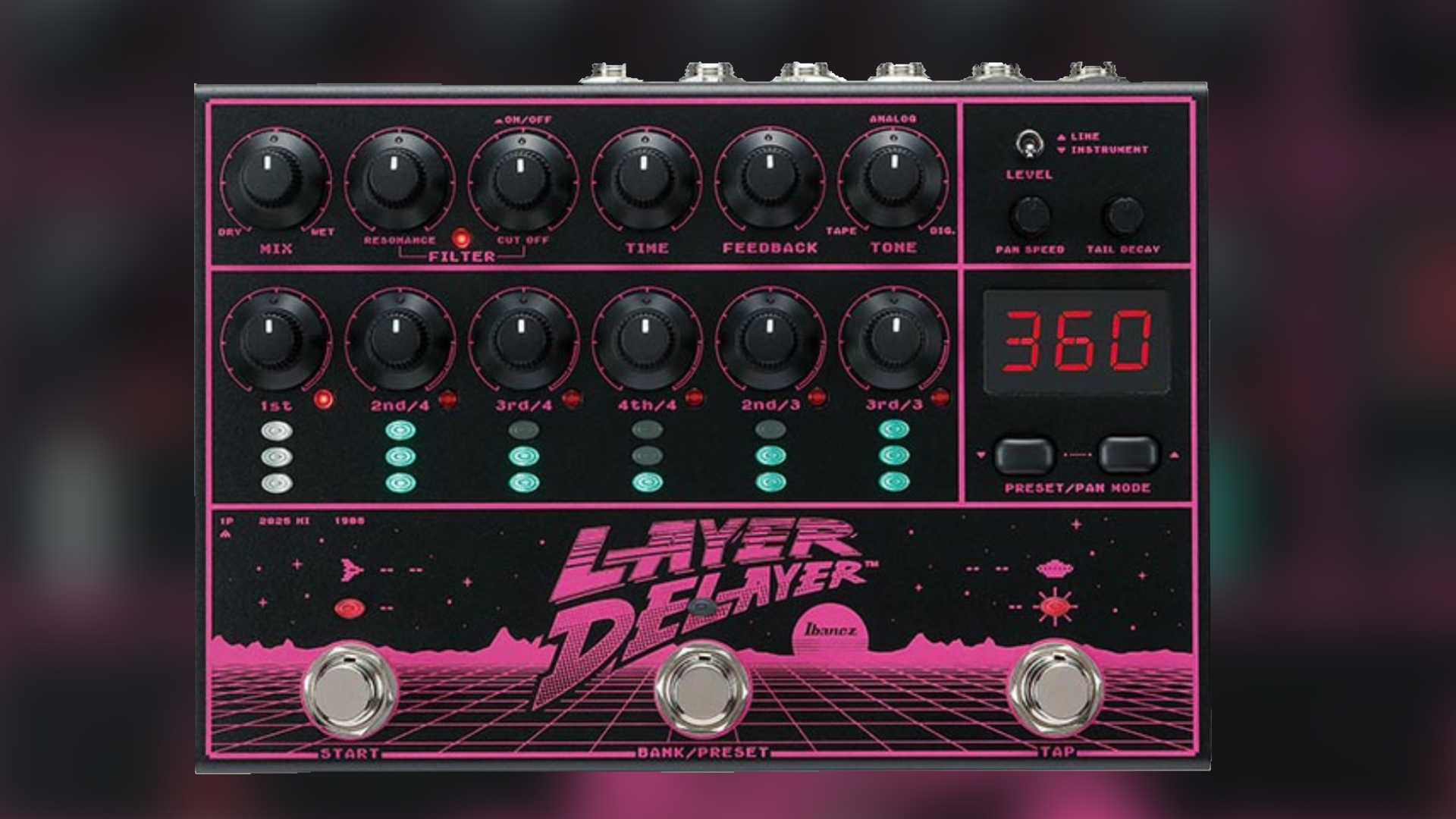LD303 Layer Delayer is a new stereo delay pedal. Ibanz has chosen visuals for the LD303 Layer Delay that strongly resemble 80s and synthwave aesthetics. But modern, innovative technology is at work in the pedal.