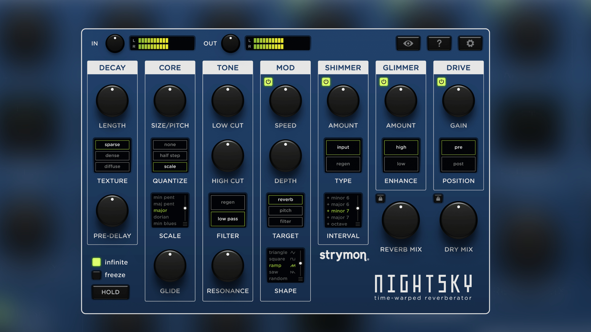 Then, you also have your classic parameters, like the reverb decay length, a selectable 3-mode texturizer (sparse, dense, diffuse), and pre-delay. The decay can also be set on hold with two modes: infinite or freeze, giving you two different “endless” behaviors.