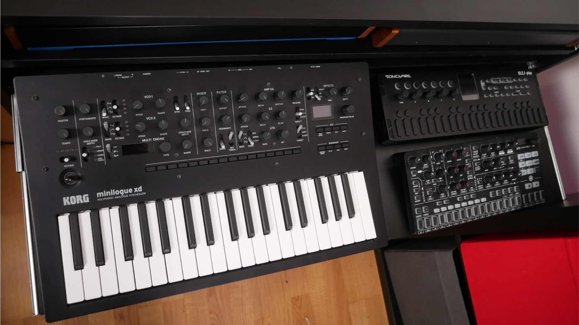 Houston, we have a problem. The Korg Minilogue XD just barely doesn’t fit, as it’s a bit too tall. Depending on your cabling skills, you can even fit two desktop synths, as in the example with the IK UNO Synth Pro and the Sonicware ELZ_play.