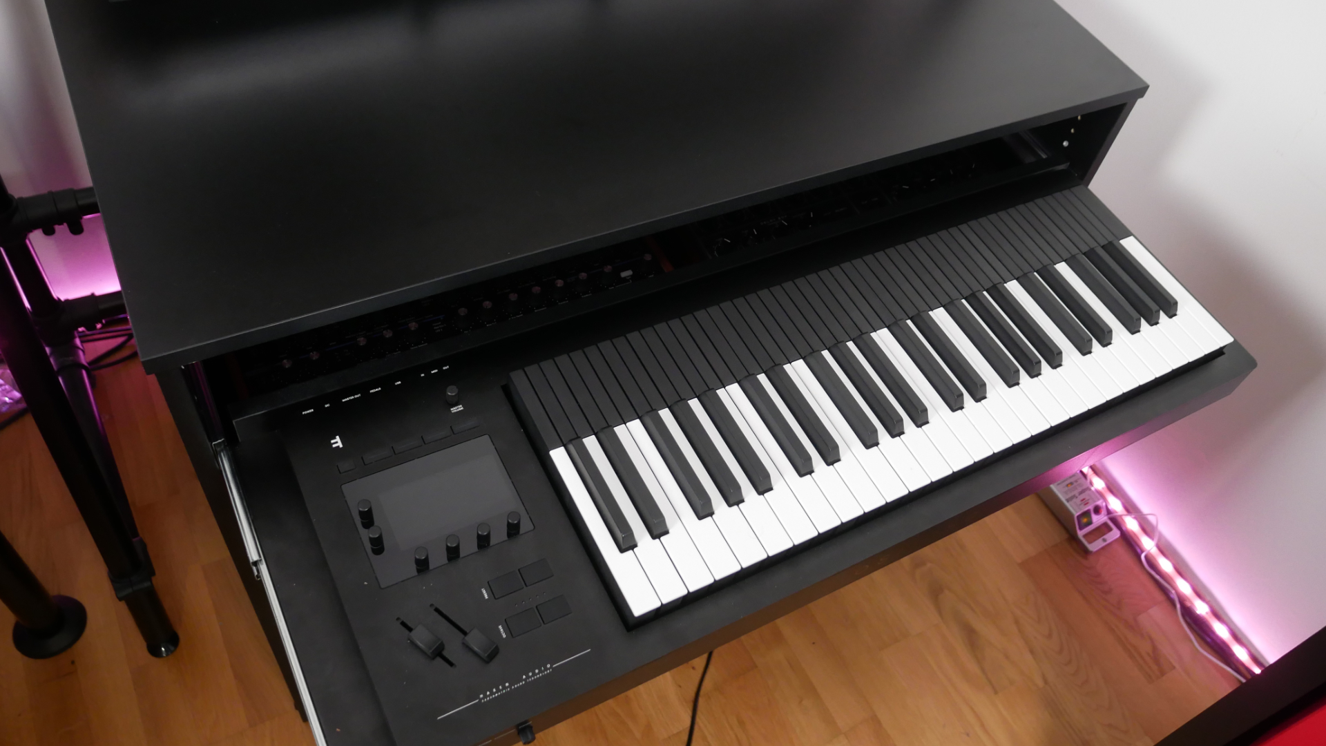 It seems Thomann didn’t measure the drawer slides perfectly. None of my 61-key keyboards fit so far. Or maybe I have only synths that are too tall and wide, who knows. I give it a second try in another configuration.