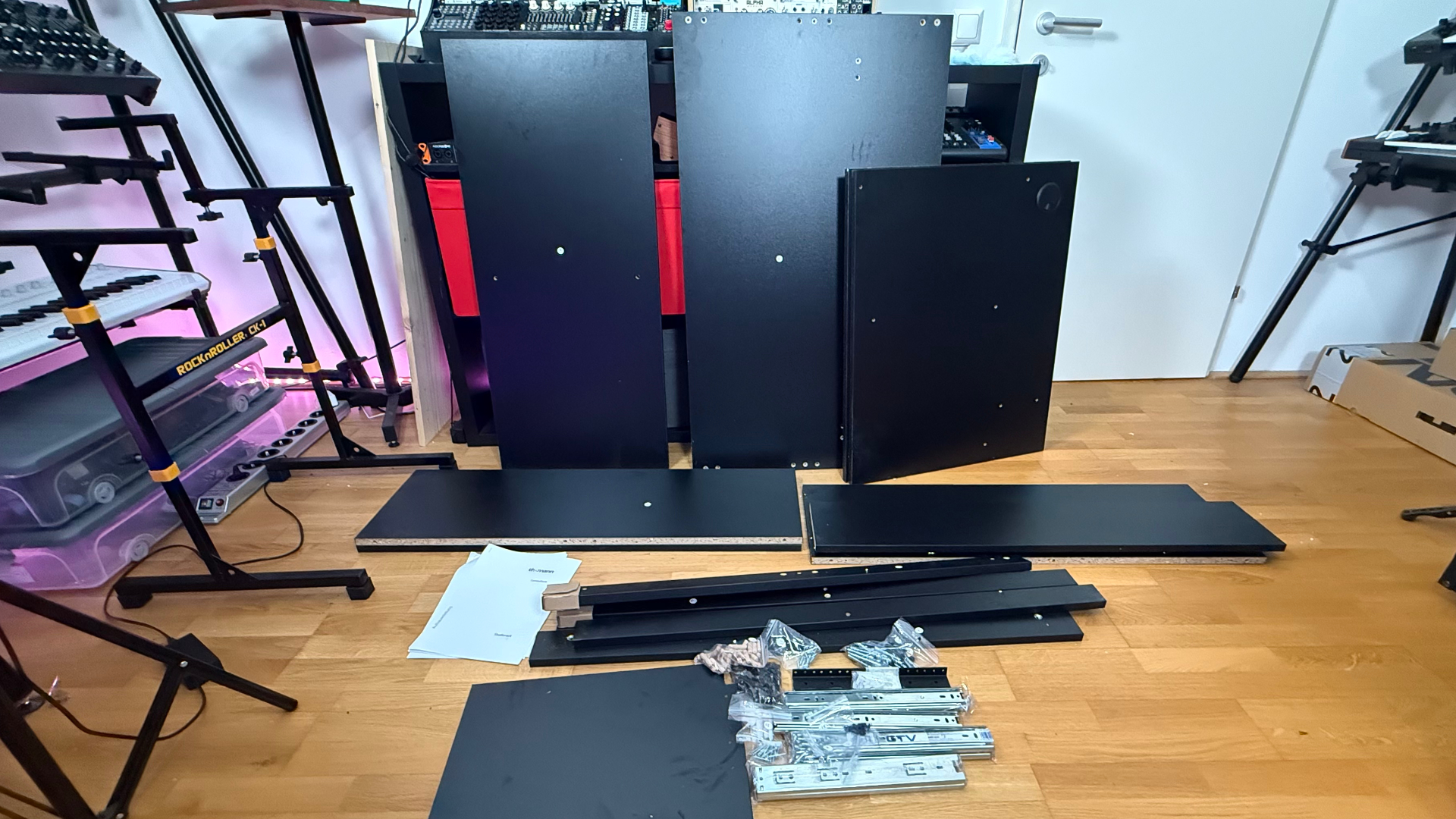 The photos show the ComboRack in the standard configuration as shown in the assembly instructions. Don’t worry: the drawers can be adjusted in height. My goal is to fit in 1-2 keyboards, a few desktops, and some pedals. Let’s give it a try with some examples.
