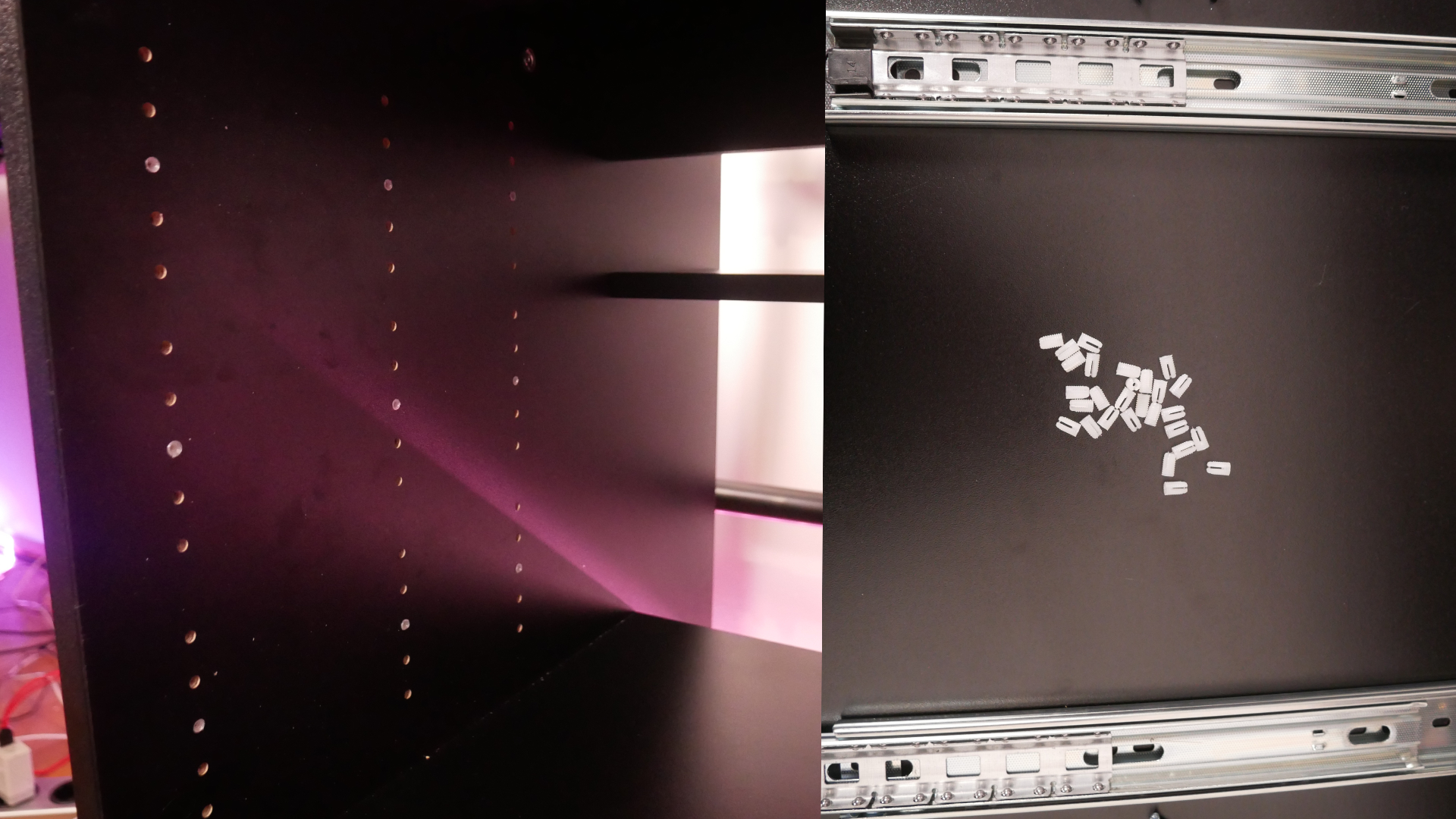One of the first steps is attaching the drawer rails to the side panels. Here, you determine their size. Since I’m reviewing the ComboRack, I’m setting it up according to the instructions. However, you’ll see later that this isn’t necessarily the best setup.