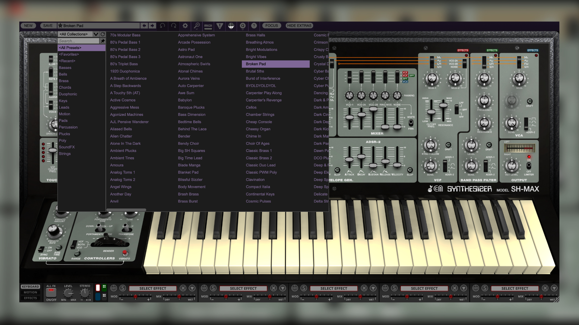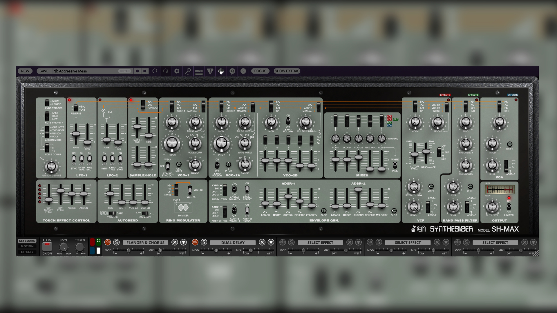 The hardware SH Synthesizers didn’t feature classic effects. The SH-MAX improves on this, offering a range of effects available in a dedicated multi-FX window. At the beginning, we saw how complex and intricate signal routing can be.