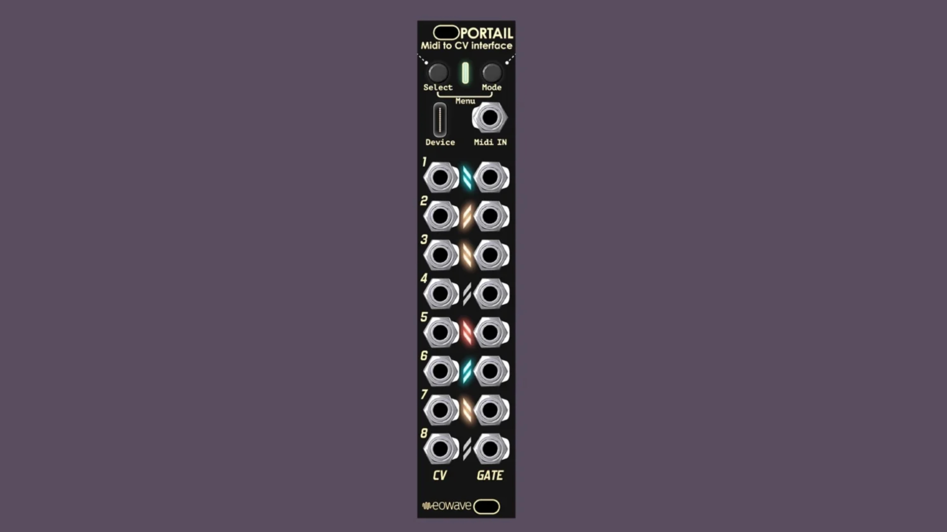 Portail is a new, 5HP, flexible, configurable MIDI-to-CV interface with eight CV and dynamic gate outputs. Next to this, it has a minijack MIDI-TRS input, a USB-C device port, and two buttons for the menu and mode.
