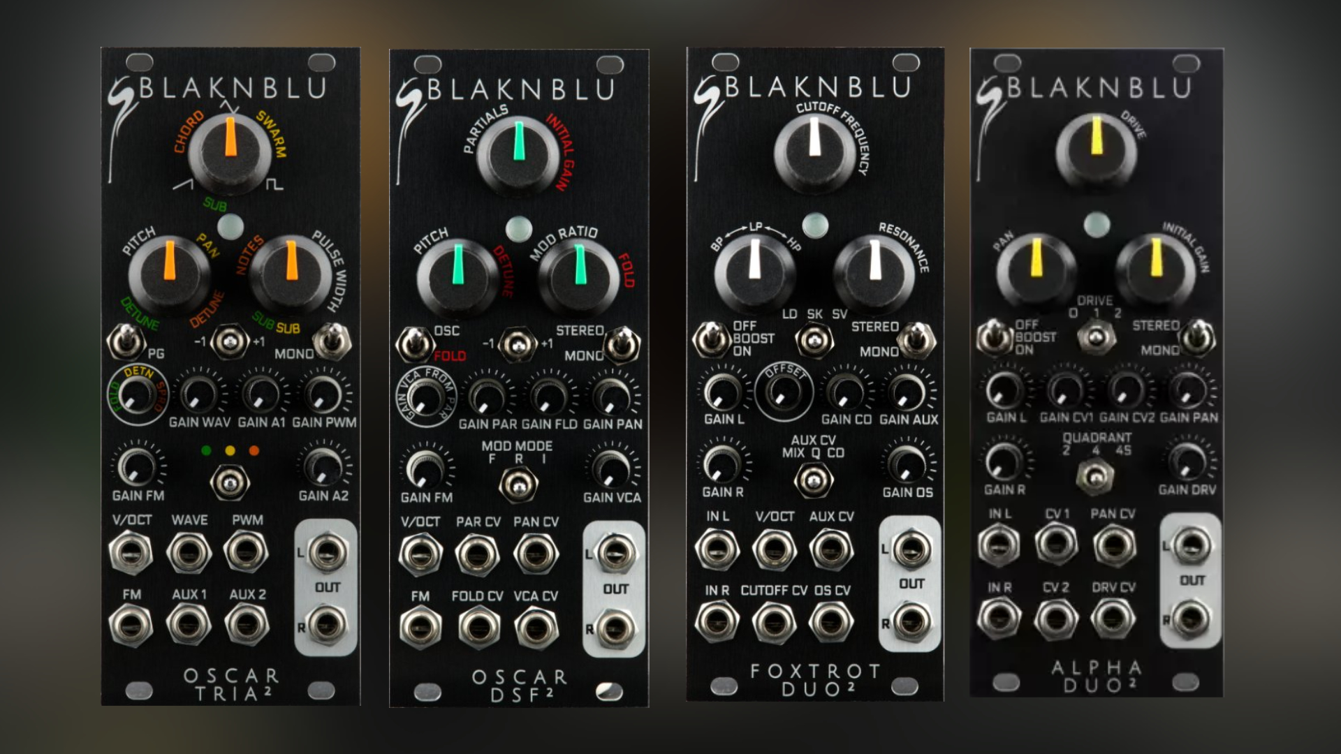 BlaknBlu has released mk2 versions of its Eurorack modules: Oscar Tria, DSF, Foxtrot Duo filter, and Alpha Duo VCA, with new designs and improved feature sets.